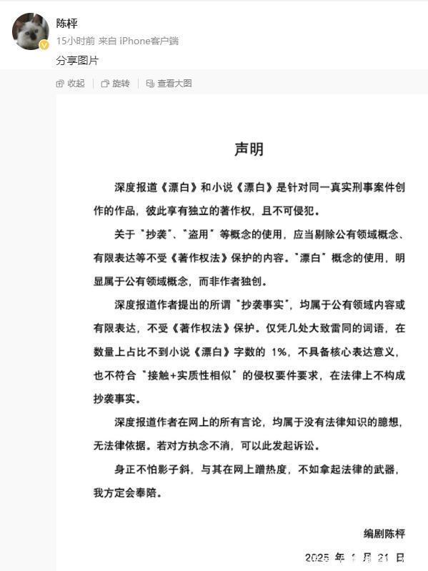 编剧陈枰在20日晚发出声明,称这是2016年应又名电影制片东说念主邀约,根据“杨树彬团伙911杀东说念主碎尸案”为原型创作的电影脚本。而后,她本东说念主对公安以及主犯家属进行了采访,并创作出了演义,于2022年3月出版,“2023年底,有制片公司看中了已脱稿的《漂白》全脚本,我随后将脚本文章权转让(给)该公司。2024年2月,《漂白》电视剧追究开机。”