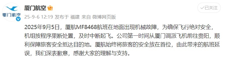 今天(9月6日)中午时候,@厦门航空 针对此事发布了情况评释。厦航称,9月5日,厦航MF8468航班在大地出现机械故障,为确保飞翔十足安全,机组按武艺武断贬责,实时中断升起。公司第一工夫从厦门调派飞机赶赴贵阳,奏凯保险搭客安全抵达指标地。厦航经久将搭客的安全放在首位,由此带来的航班延误深表歉意。