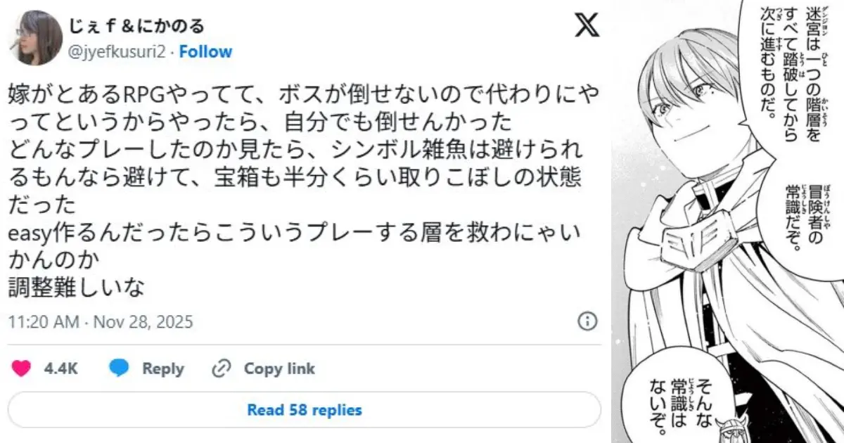 近日,日本又名X用户的共享偶而引爆游戏圈:妻子玩某款RPG时,因"全程避绽放盘杂兵、漏掉近半数宝箱",最终卡在Boss战升沉不得。他受邀"代打救场",效果一样惨败罢了,这让他忍不住提问:"Easy模式的磋磨初志开云体育,难说念不该缓助这类玩家吗?"这篇帖子连忙勾起海量玩家共识,一场对于RPG难度磋磨与玩家需求的大顾问就此伸开。