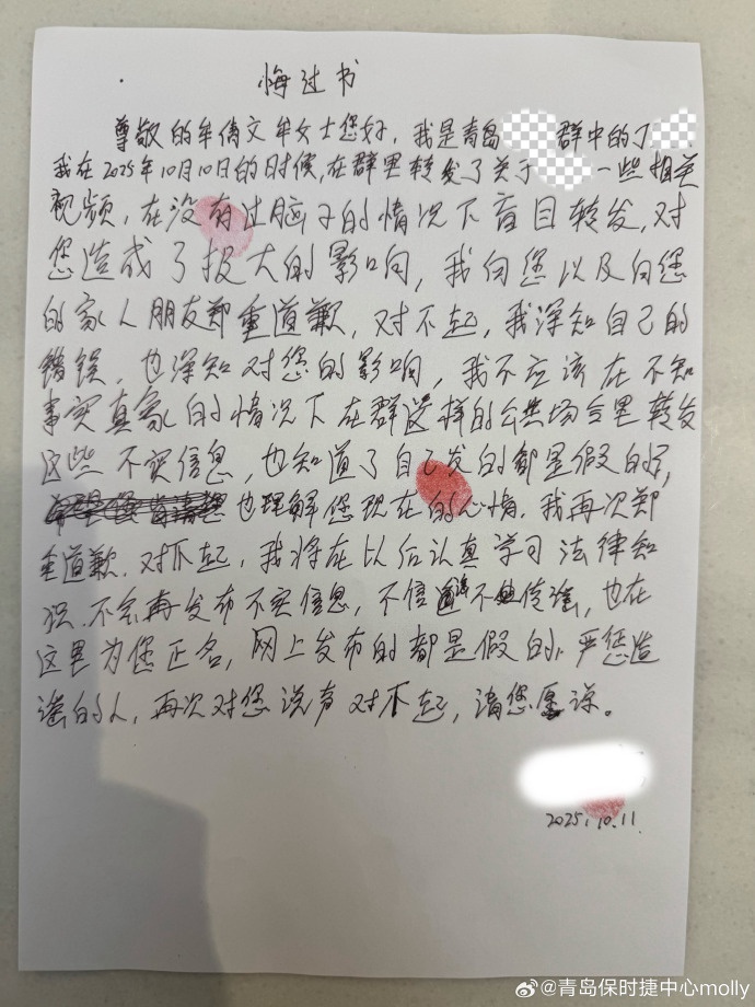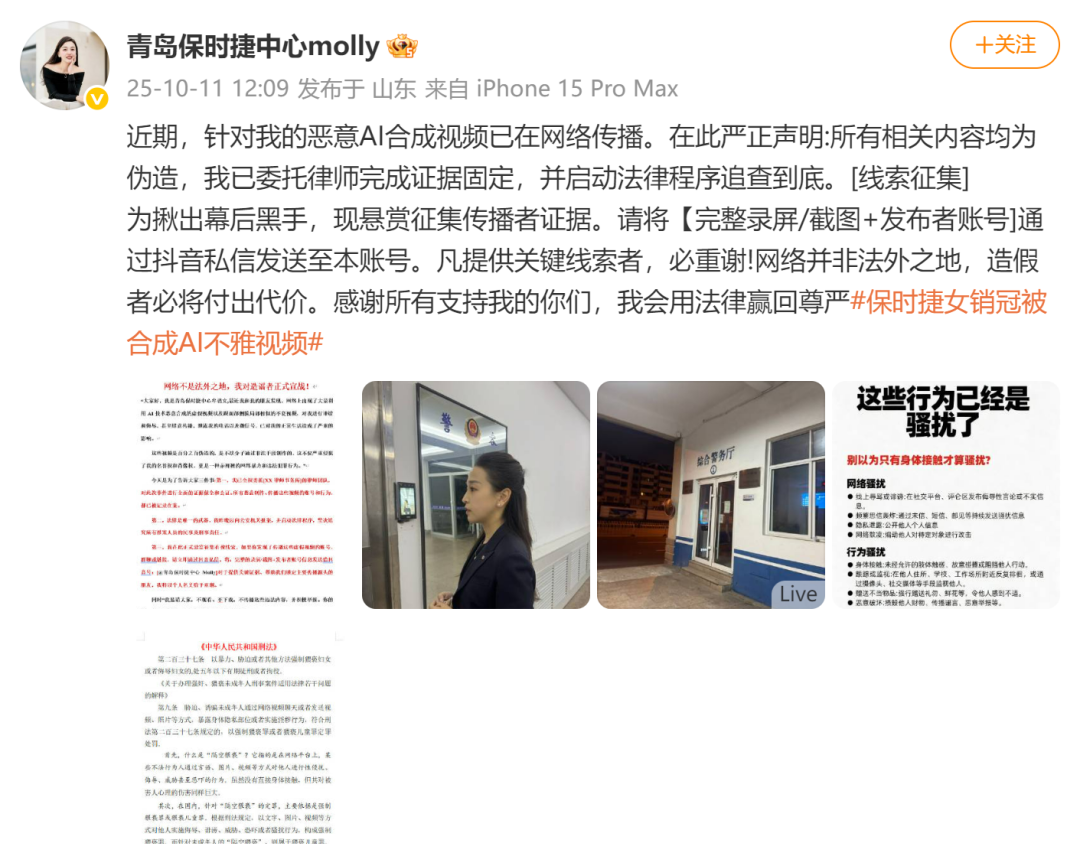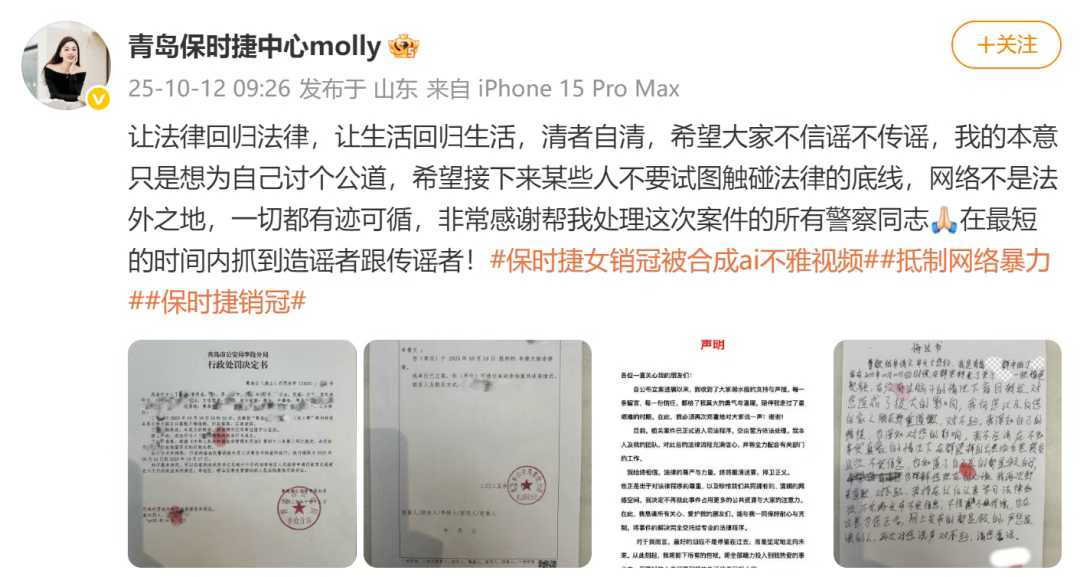 10月12日,青岛保时捷女销冠牟女士在嘱咐平台晒出青岛市公安局李沧分局行政处罚决定书并发文写说念:让法律记忆法律,让生涯记忆生涯,清者自清,但愿大家不信谣不传谣,我的本意仅仅思为我方讨个公正,但愿接下来某些东说念主不要试图触碰法律的底线,齐集不是法外之地,一切齐有迹可循,罕见感谢帮我处理此次案件的通盘捕快同道,在最短的技术内握到训斥者跟传谣者!