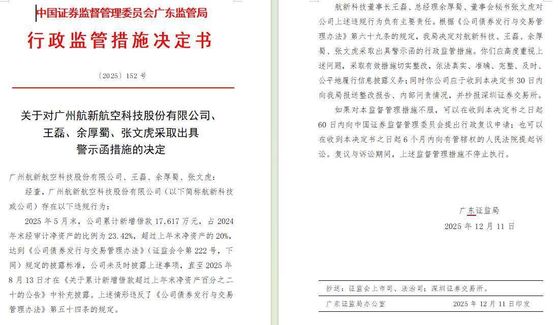 决定书表示,广州航新航空科技股份有限公司存在以下违游记径:2025年5月末,公司累计新增借款17,617万元,占2024年末经审计净金钱的比例为23.42%,当先上年末净金钱的20%,达到《公司债券刊行与走动惩处目的》递次的露馅圭表,公司未实时露馅上述事项,直至2025年8月13日才在《对于累计新增借款当先上年末净金钱百分之二十的公告》中补充露馅。