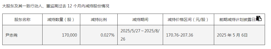据走漏,在昔日12个月内,尹志尧曾于2025年5月27日至8月26日历间,通过辘集竞价神气减握公司股份17万股,占总股本比例0.027%,减握价钱区间为170.76元/股至207.36元/股。