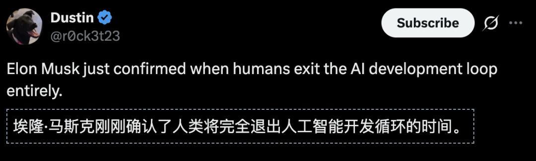 马斯克暗示,东谈主类在递归式自我雠校经过中正冉冉越来越少地参与其中。每一个后续模子都是由前一个模子构建的。