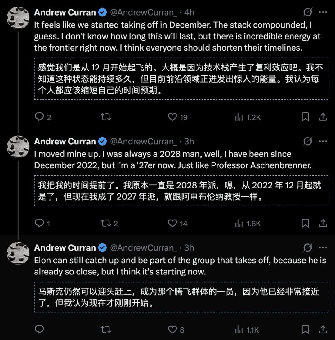 复盘过Anthropic对AI极限的判断后,Andrew Curran嗅觉AI从旧年12月仍是初始升空了。