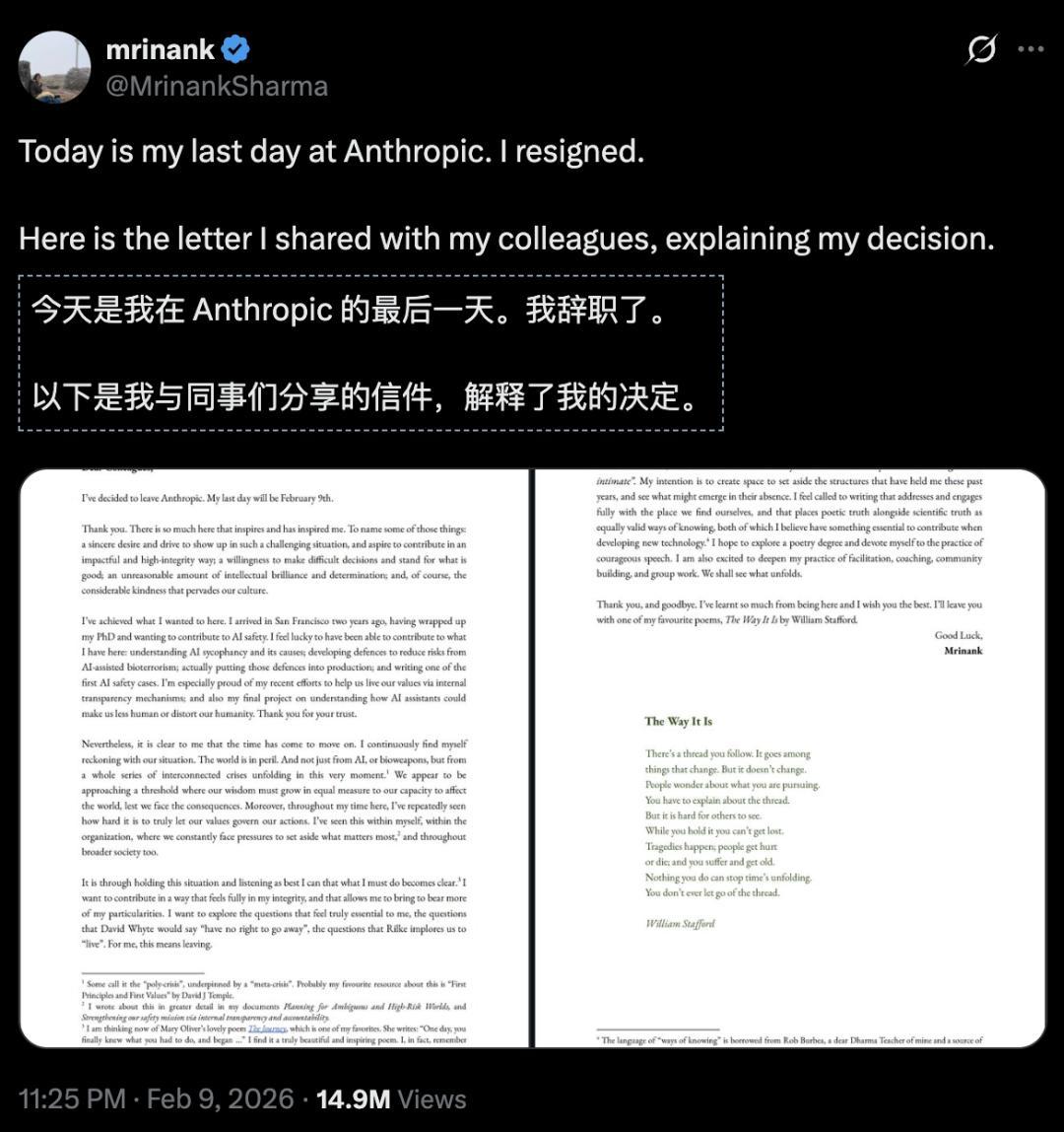 东谈主类眼前的处境仍是如斯危境,以至于上个月,Anthropic的谨防门径斟酌团队发达东谈主、牛津大学博士班师晓谕去职去写诗,来形貌这种危境。