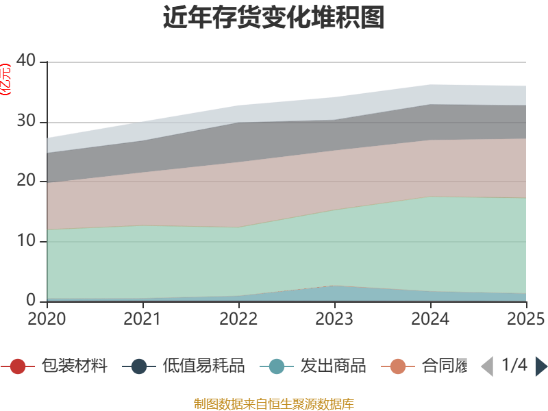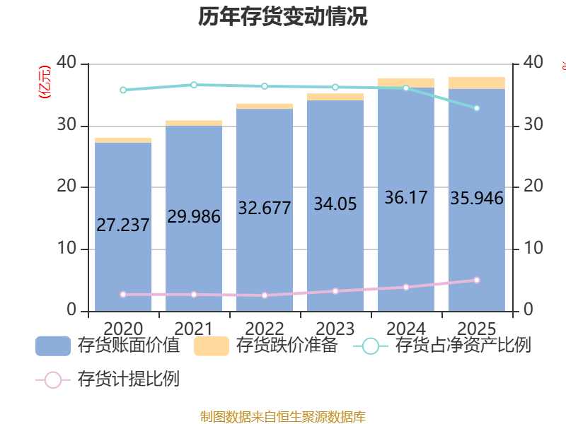 从存货变动来看,抵制2025年末,公司存货账面价值为35.95亿元,占净钞票的32.79%,较上年末减少2231.37万元。其中,存货跌价准备为1.88亿元,计提比例为4.98%。