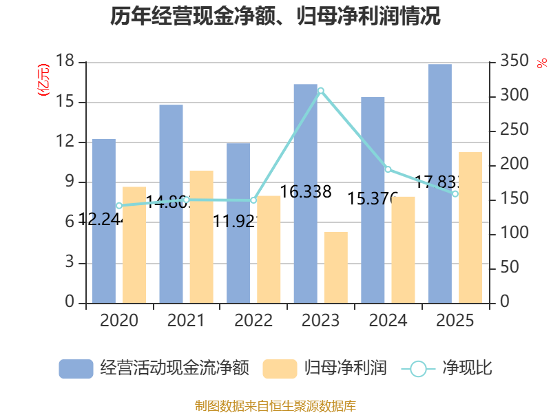 抵制2025年,公司野心活动现款流净额为17.83亿元,同比增长15.98%;筹资活动现款流净额-6.41亿元,同比减少10.34亿元;投资活动现款流净额-12.38亿元,上年同时为-17.05亿元。